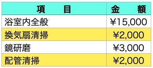 扉、天井、換気扇カバーとフィルター(内部は対象外)壁面、照明、鏡、水洗金具、シャワーヘッド&ホース、浴槽、床、排水口、窓ガラス内側